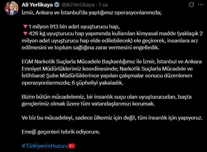 EGM Narkotik Suçlarla Mücadele Başkanlığımız ile İzmir, İstanbul ve Ankara Emniyet Müdürlüklerimiz koordinesinde; Narkotik Suçlarla Mücadele ve İstihbarat Şube Müdürlüklerince yapılan çalışmalar sonucu düzenlenen operasyonlarımızda; 6 şüpheliyi yakaladık. Bizim bütün mücadelemiz, bir insanlık suçu olan uyuşturucudan, başta gençlerimiz olmak üzere tüm vatandaşlarımızı korumak. Ve biz bu mücadeleyi, sadece ülkemiz için değil, tüm insanlık için yapıyoruz. Emeği geçenleri tebrik ediyorum.''