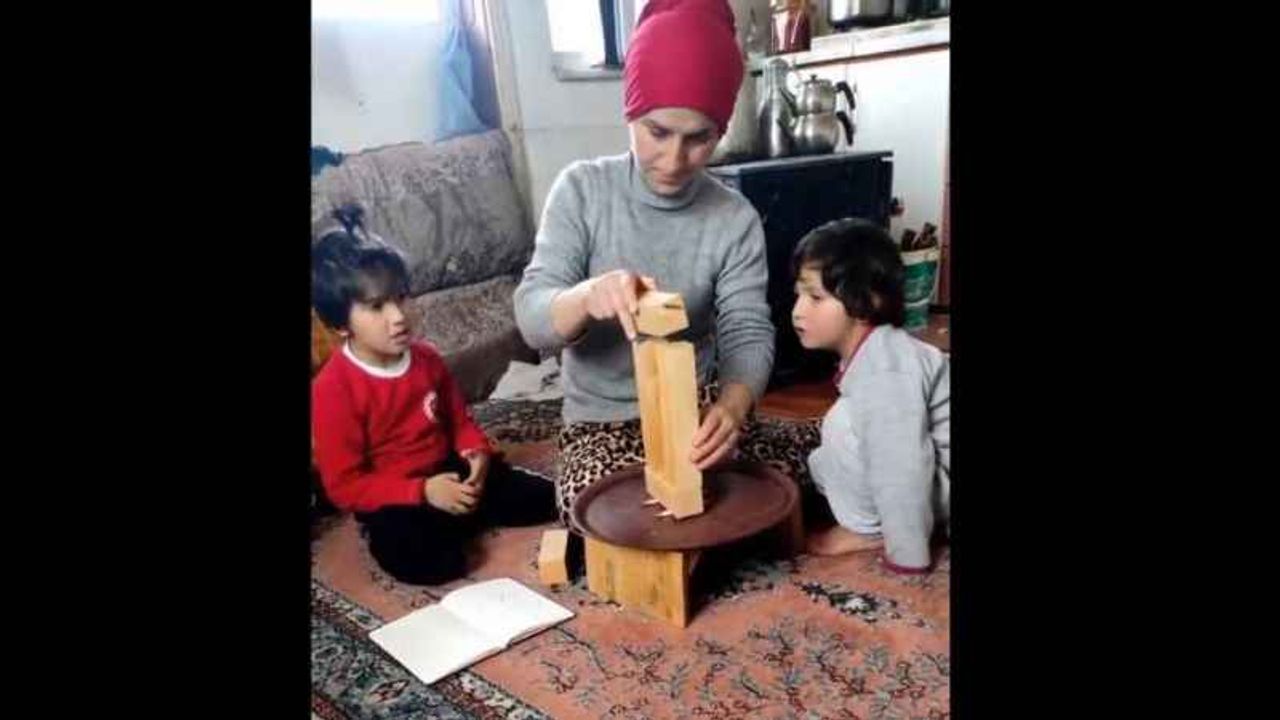 Sismik izolatörlü binaların ileri geri sallanarak ayakta kaldığını sismik izolatörsüz binaların çökerek yıkıldığını anlatan annenin eğitim malzemeleri oldukça basit ve pratik: 2 adet kalem, 1 tepsi ve 5-6 tahta parçası.