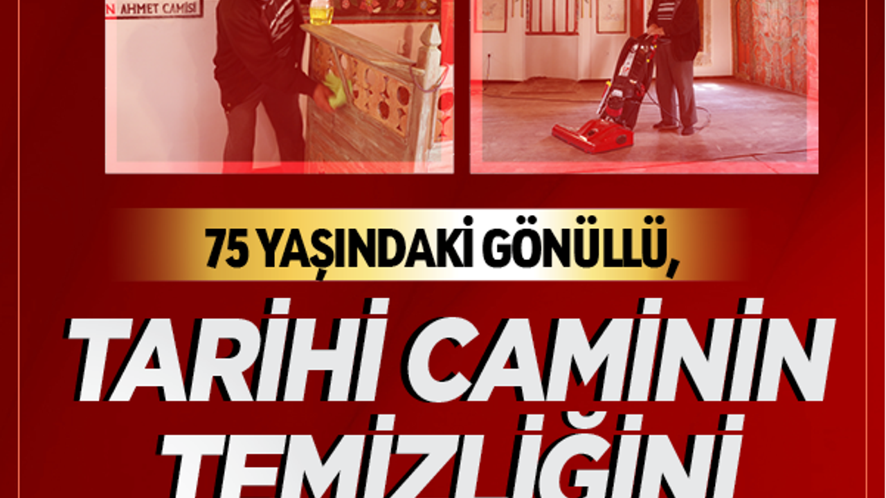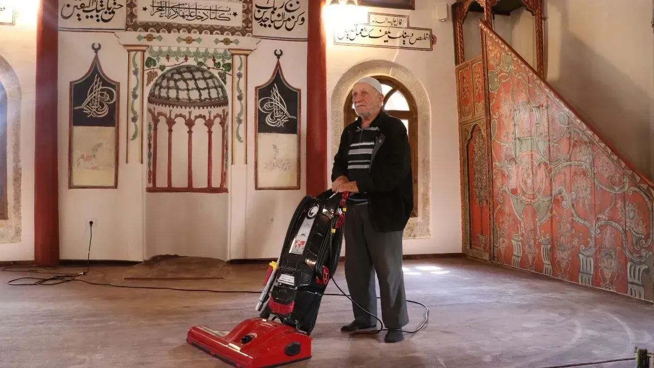 Caminin temizliğini gönüllü olarak üstlenen 75 yaşındaki Bekir Badat, her hafta cuma günlerinden önce camiye gelip hem avlunun hem de iç mekânın temizliğini yapıyor.