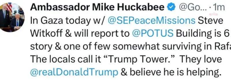 Mike Huckabee’nin ABD’nin Orta Doğu Özel Temsilcisi Steve Witkoff ile birlikte Gazze’de bir yardım dağıtım merkezine yaptığı ziyaretin ardından yaptığı paylaşım, sosyal medya kullanıcılarının dikkatinden kaçmadı.
