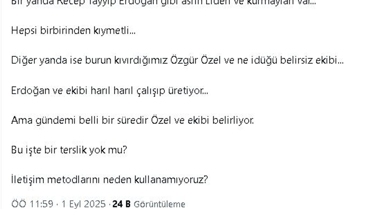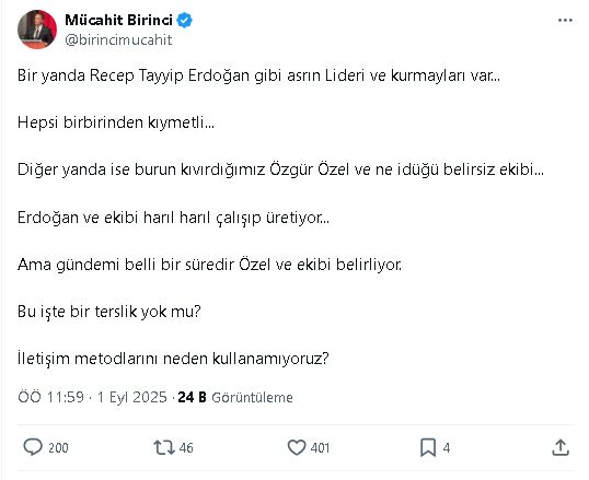Mücahit Birinci sosyal medyadan yaptığı paylaşımda Cumhurbaşkanı ve AKP Genel Başkanı Recep Tayyip Erdoğan'ın ekibinin çalışmasına rağmen gündemi CHP lideri Özgür Özel ve ekibinin belirlediğini iddia etti.