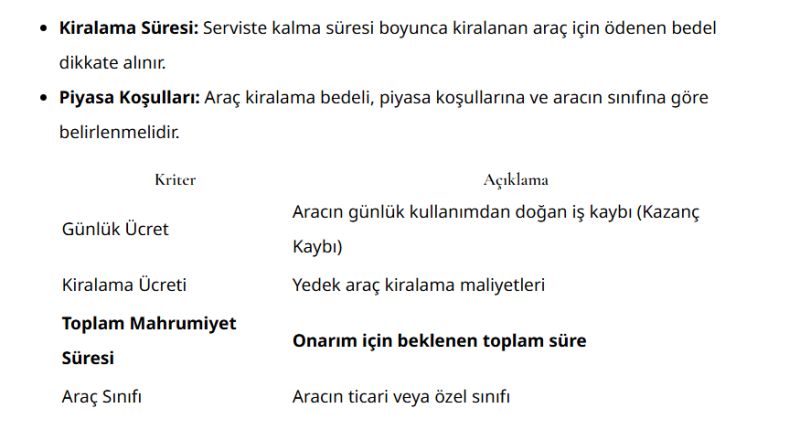 Kazanç Kaybı Hesaplaması: Araç sahibi, aracın serviste kaldığı süre boyunca oluşan iş kaybını belgelemelidir. Bu kayıp genellikle günlük ortalama kazanç üzerinden hesaplanır.