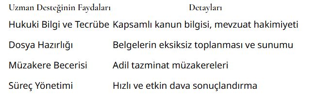Müzakere Becerisi: Karşı tarafla yapılacak olan her türlü müzakere ve iletişimde, uzman iyi bir temsilci olabilir. Müzakere becerilerini etkin bir şekilde kullanarak, daha adil ve makul bir tazminat elde etme şansını artırabilir.