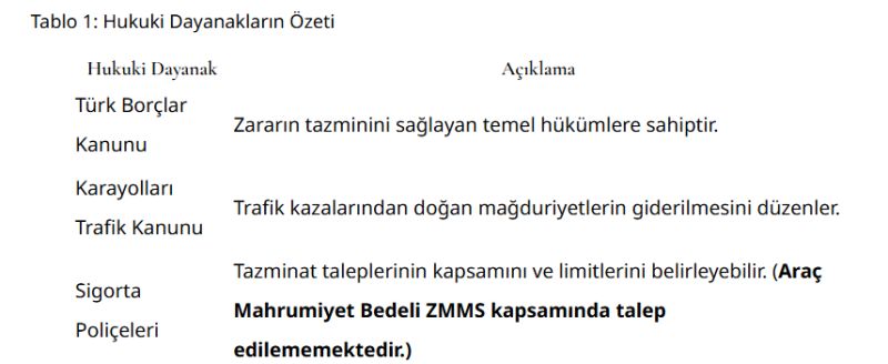 Sigorta Poliçeleri: Araç sahiplerinin trafik sigortaları ve kasko poliçeleri, kaza sonrası yaşanabilecek maddi zararların tazmin edilmesi için önemli dayanıklardır. Poliçe şartları, tazminat taleplerinin kapsamını ve limitlerini belirleyebilir. Ancak Araç Mahrumiyet Bedeli ZMMS kapsamında talep edilememektedir.