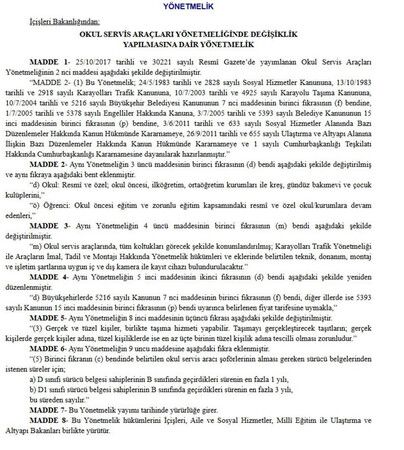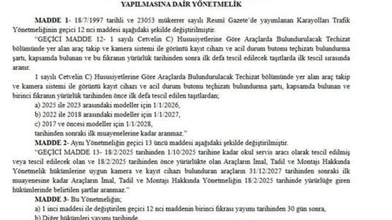 Bir diğer yandan okul servislerine yönelik geçici bir düzenleme de yer aldı. Buna göre, 18 Şubat 2025 ile 1 Ekim 2025 tarihleri arasında okul servisi olarak tescil edilen veya edilecek ve önceki mevzuata uygun kamera-kayıt cihazı bulunduran araçlar için yeni şartlar 31 Aralık 2027’ye kadar ertelendi.