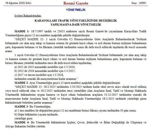 İçişleri Bakanlığı tarafından hazırlanan Karayolları Trafik Yönetmeliğinde Değişiklik Yapılmasına Dair Yönetmelik, Resmi Gazete’de yayımlandı. Yönetmelikle birlikte araçlarda bulunması zorunlu olacak araç takip ve kamera sistemi, görüntü kayıt cihazı ile acil durum butonu uygulamasının yürürlük esasları belirlendi.