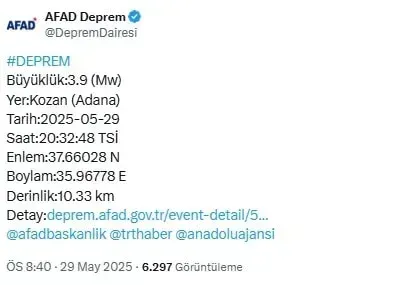 Afet ve Acil Durum Yönetimi Başkanlığı (AFAD) verilerine göre saat 20:32’de Adana’nın Kozan ilçesinde 3.9 büyüklüğünde bir deprem meydana geldi.