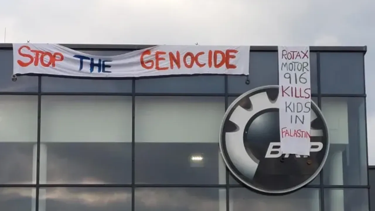 Fabrikaya girişleri engelleyen gruptaki bazı eylemciler, binanın çatısına çıkarak Filistin bayrağı ve "Soykırımı durdurun" yazılı pankart açtı. Filistin Dayanışması Avusturya'dan yapılan yazılı açıklamada, BRP Rotax'ın ürettiği motorlarla çalışan insansız hava araçlarının İsrail'in Gazze'de yürüttüğü soykırımda kullanıldığının kanıtlandığı bildirildi. Açıklamada, Avusturya'nın bu silah ticaretiyle savaş ve uluslararası hukuku ihlal ettiği belirtilerek, Viyana hükümetine İsrail ile her türlü silah ticaretini derhal durdurması için çağrı yapıldı.