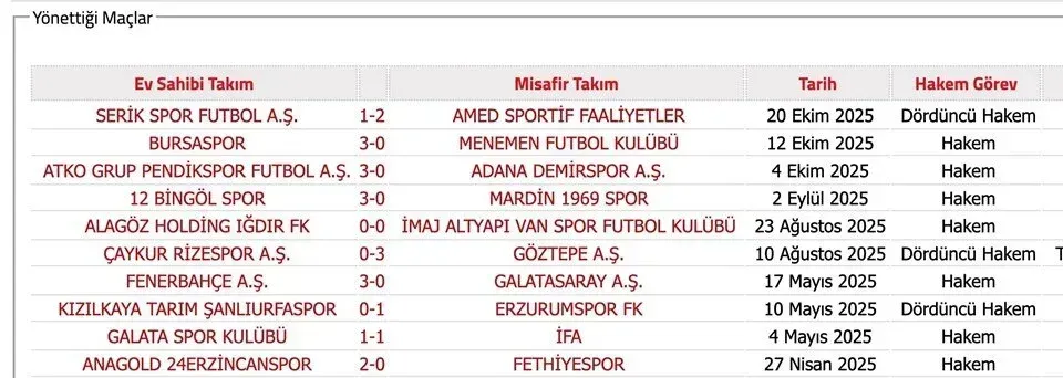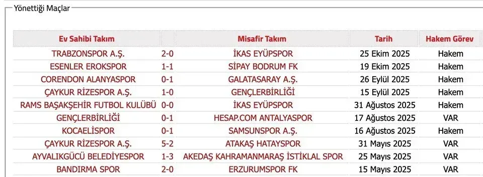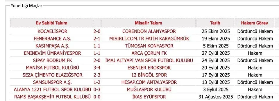 Üst klasman hakemi Melih Kurt'un görev aldığı son 10 karşılaşma.