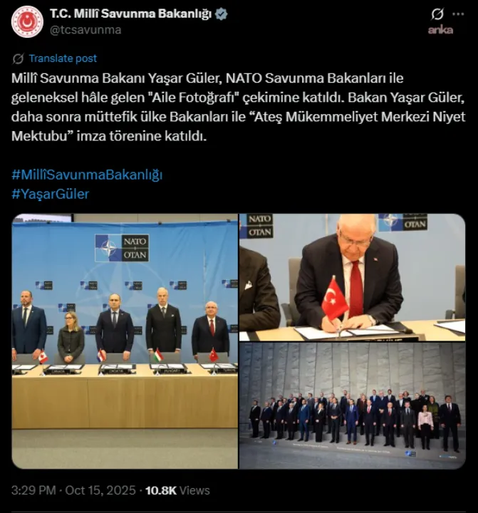 Milli Savunma Bakanlığı'nın (MSB) resmi X hesabından yapılan paylaşımda, "Milli Savunma Bakanı Yaşar Güler, NATO Savunma Bakanları ile geleneksel hale gelen 'Aile Fotoğrafı' çekimine katıldı. Bakan Yaşar Güler, daha sonra müttefik ülke Bakanları ile 'Ateş Mükemmeliyet Merkezi Niyet Mektubu' imza törenine katıldı" bilgilerine yer verildi.