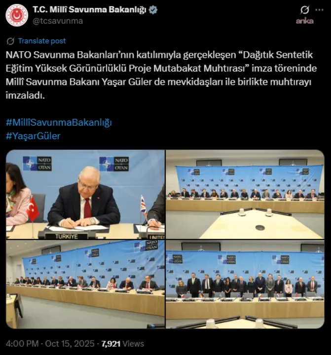 Güler ayrıca, NATO üyesi ülkelerin Savunma Bakanları'nın katılımıyla yapılan törende Dağıtık Sentetik Eğitim Yüksek Görünürlüklü Proje Mutabakat Muhtırası'nı imzaladı.