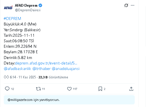 "Sındırgı ilçemizde 4,9 büyüklüğünde bir deprem meydana gelmiştir. An itibarıyla olumsuz bir durum yoktur. Depremden etkilenen vatandaşlarımıza geçmiş olsun dileklerimi sunuyorum. Allah ülkemizi ve milletimizi afetlerden korusun."