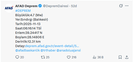 Afet ve Acil Durum Yönetimi Başkanlığı'nın (AFAD) internet sitesinde yer alan bilgiye göre, saat 06.16'da merkez üssü Sındırgı ilçesi olan 4,7 büyüklüğünde sarsıntı kaydedildi.