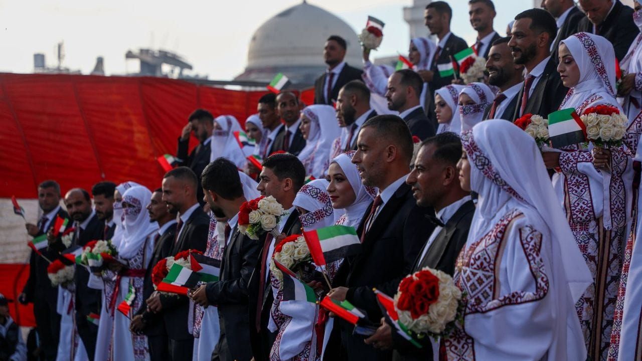 Gazze Şeridi'nin Han Yunus kentinde, BAE'nin insani yardım operasyonu kapsamında düzenlenen toplu nikah töreninde 54 çift, savaşın yarattığı enkazlar arasında dünya evine girdi.