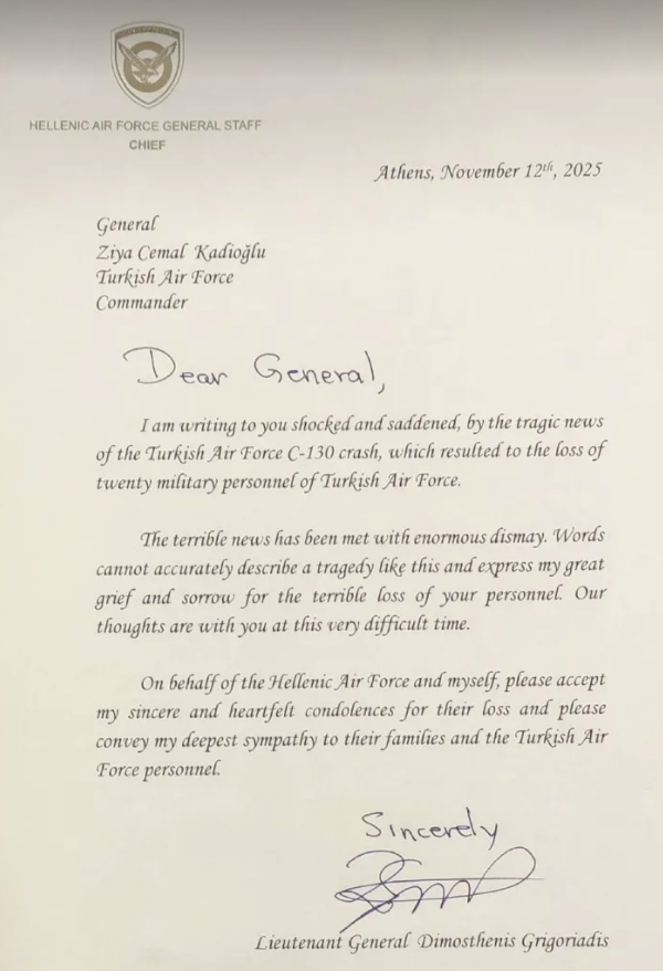 Yoğun tepkiler üzerine bu paylaşımını dakikalar içinde silen Yunan Hava Kuvvetleri, komutanları Korgeneral Dimosthenis Grigoriadis tarafından gönderilen 12 Kasım tarihli taziye mesajını yine X hesabından yayınladı.