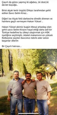 Paylaşımda, Hakan Yüksel’in bugün, şehit edilen mesai arkadaşı Selim Kiraz’ın hayalini kurduğu daha adil bir Türkiye hedefi doğrultusunda HSK üyeliğine seçildiği vurgulandı.