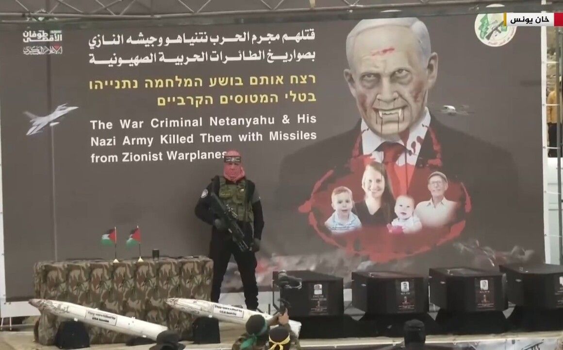 Esir takası yaptıkları 20 Şubat 2025 günü, İsrail tarafından bombalanarak öldürülen Bibas ailesinin dört ferdinin teslim töreninde o yine şeytan suretinde resmedildi. Bu kişiler Nir Oz askeri üssünde ele geçirilmişti.