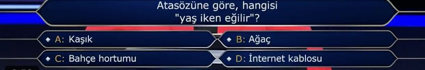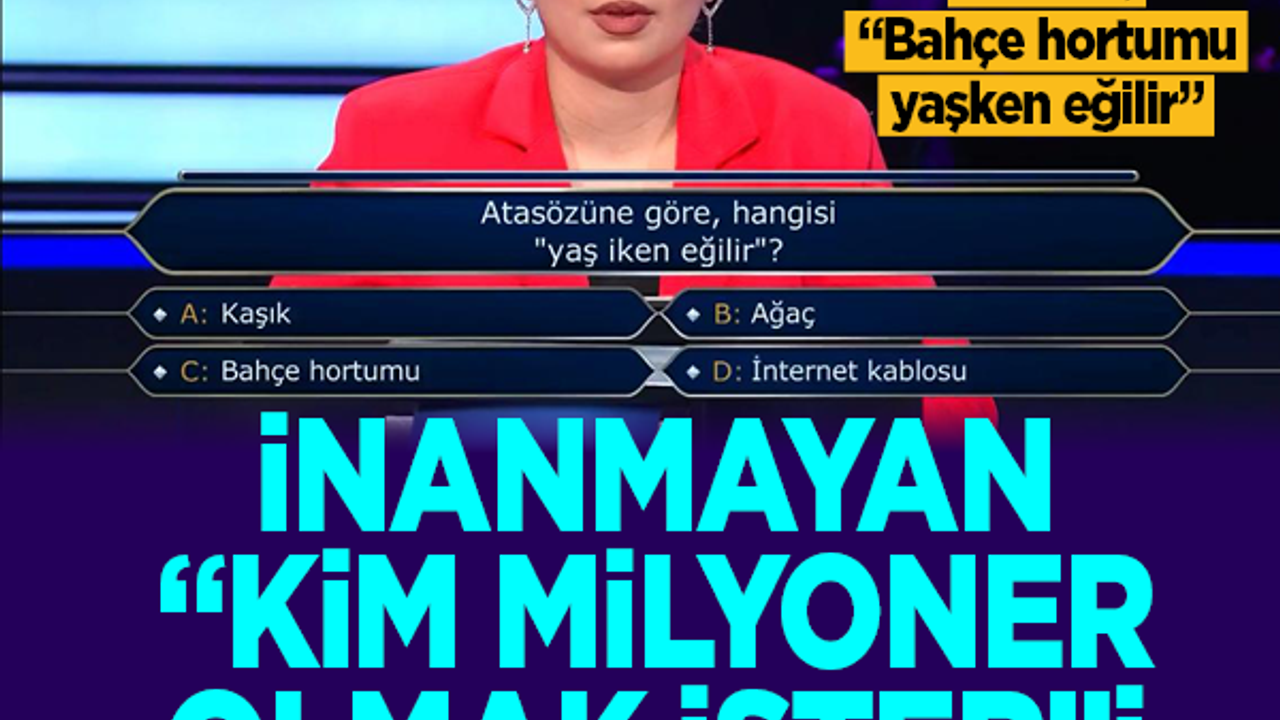 Türkiye'de milyonlarca vatandaş tarafından takip edilen Kim Milyoner Olmak İster?, dikkat çeken bir sahne yaşandı. Yarışmaya katılan Ceyda Işıkal, ilk soruda elenerek herkesi şaşırttı. Işıkal’ın karşısına “Atasözüne göre hangisi ‘yaş iken eğilir’?” sorusu çıktı. Soruya "bahçe hortumu" yanıtı veren yarışmacı ilk soruda elendi.