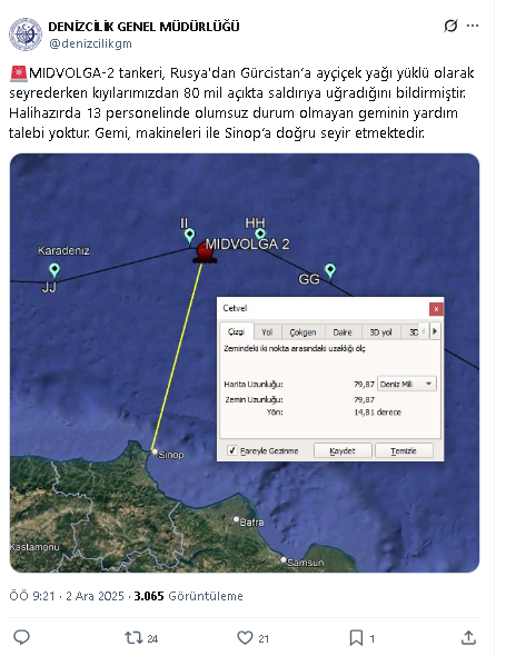 "MIDVOLGA-2 tankeri, Rusya'dan Gürcistan’a ayçiçek yağı yüklü olarak seyrederken kıyılarımızdan 80 mil açıkta saldırıya uğradığını bildirmiştir. Halihazırda 13 personelinde olumsuz durum olmayan geminin yardım talebi yoktur. Gemi, makineleri ile Sinop’a doğru seyir etmektedir."