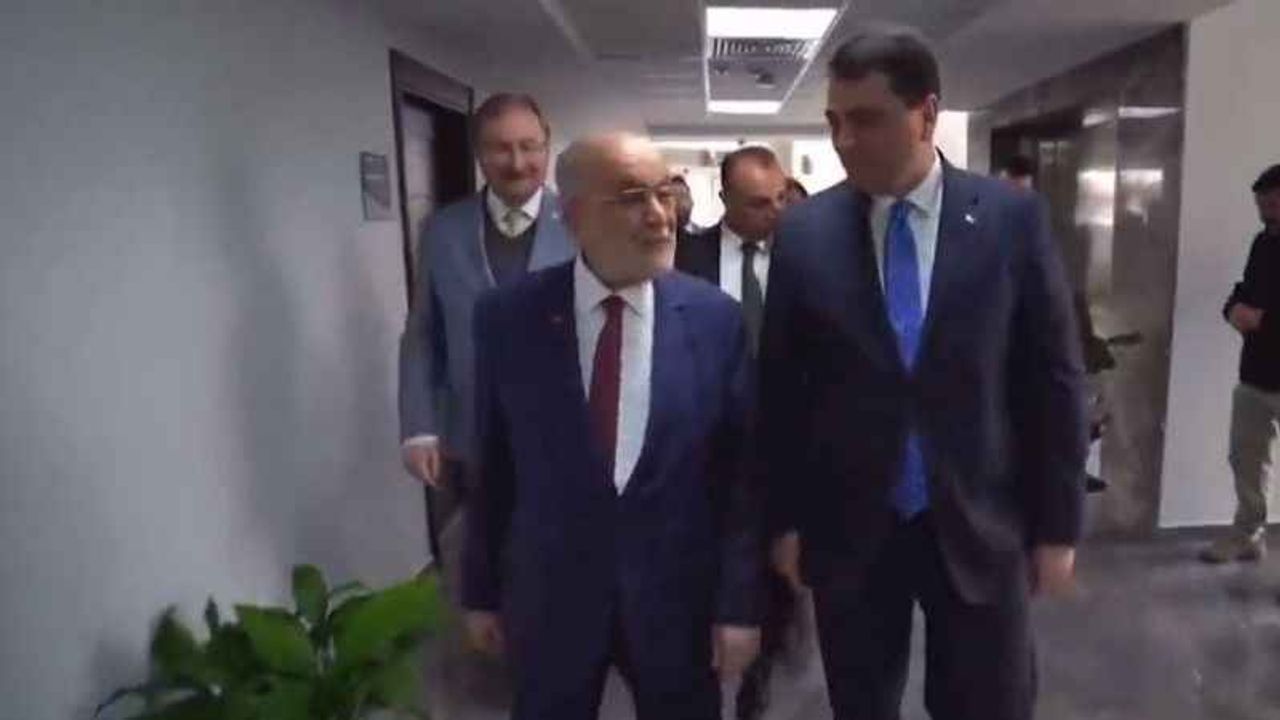 Demokrat Parti Genel Başkanı Gültekin Uysal Saadet Partisi Genel Merkezi’nin içinde toplantı masasına doğru ilerken Saadet Lideri Temel Karamollaoğlu’na ''Saadet bulmaya geliyoruz.'' Dedi.
