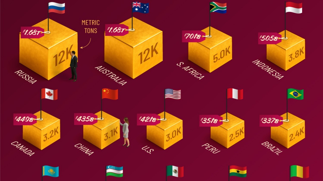 Rusya ve Avustralya'nın ardından Güney Afrika 5 bin tonluk altın yatakları ve 750 milyar doları aşan değeri ile geliyor. Endonezya'nın 3800 tonluk altın madenleri ise 500 milyar doların üzerinde pahaya sahip. Kanada'nın toplam 3200 tonluk altın madenlerinin değeri de 450 milyar doların üzerinde. Çin Halk Cumhuriyeti ise 3100 tonluk altın madenleri 450 milyar dolara yaklaşan değeri ile 6. basamakta bulunuyor.