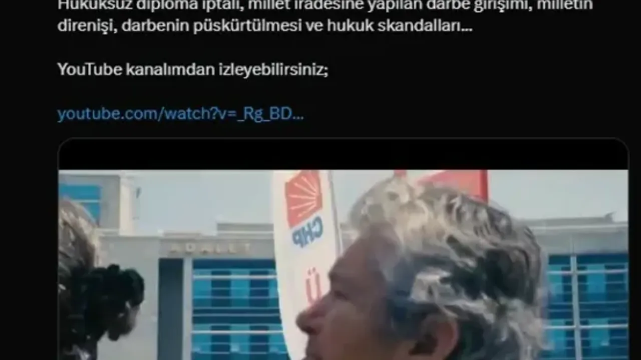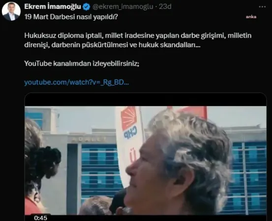Ekrem İmamoğlu'nun sosyal medya hesabından yapılan açıklamada "19 Mart Darbesi nasıl yapıldı? Hukuksuz diploma iptali, millet iradesine yapılan darbe girişimi, milletin direnişi, darbenin püskürtülmesi ve hukuk skandalları... YouTube kanalımdan izleyebilirsiniz" ifadesi kullanıldı