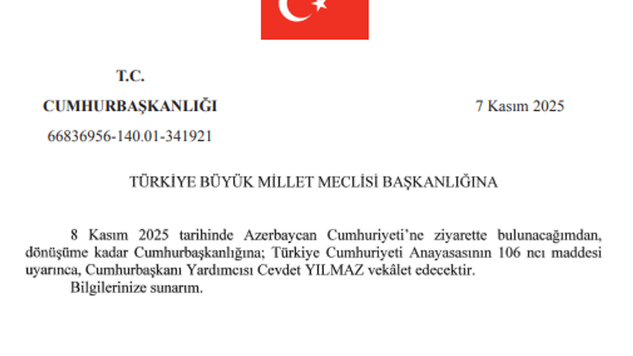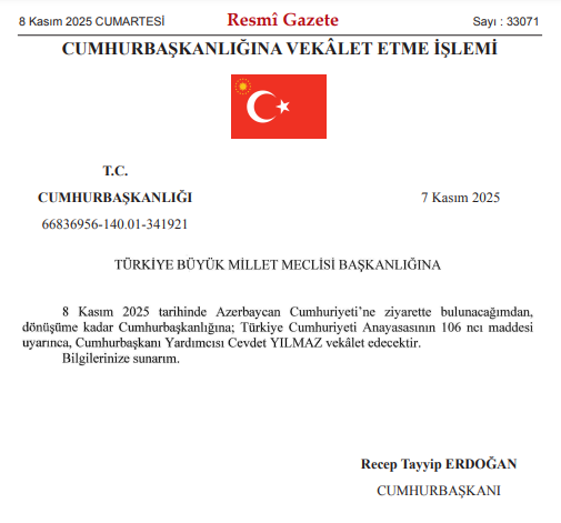 Tezkerede, Cumhurbaşkanı Erdoğan’ın 8 Kasım 2025 tarihinde Azerbaycan Cumhuriyeti’ne ziyarette bulunacağı, dönüşüne kadar Cumhurbaşkanlığı görevini Türkiye Cumhuriyeti Anayasası’nın 106’ncı maddesi uyarınca Cumhurbaşkanı Yardımcısı Cevdet Yılmaz’ın üstleneceği belirtildi.