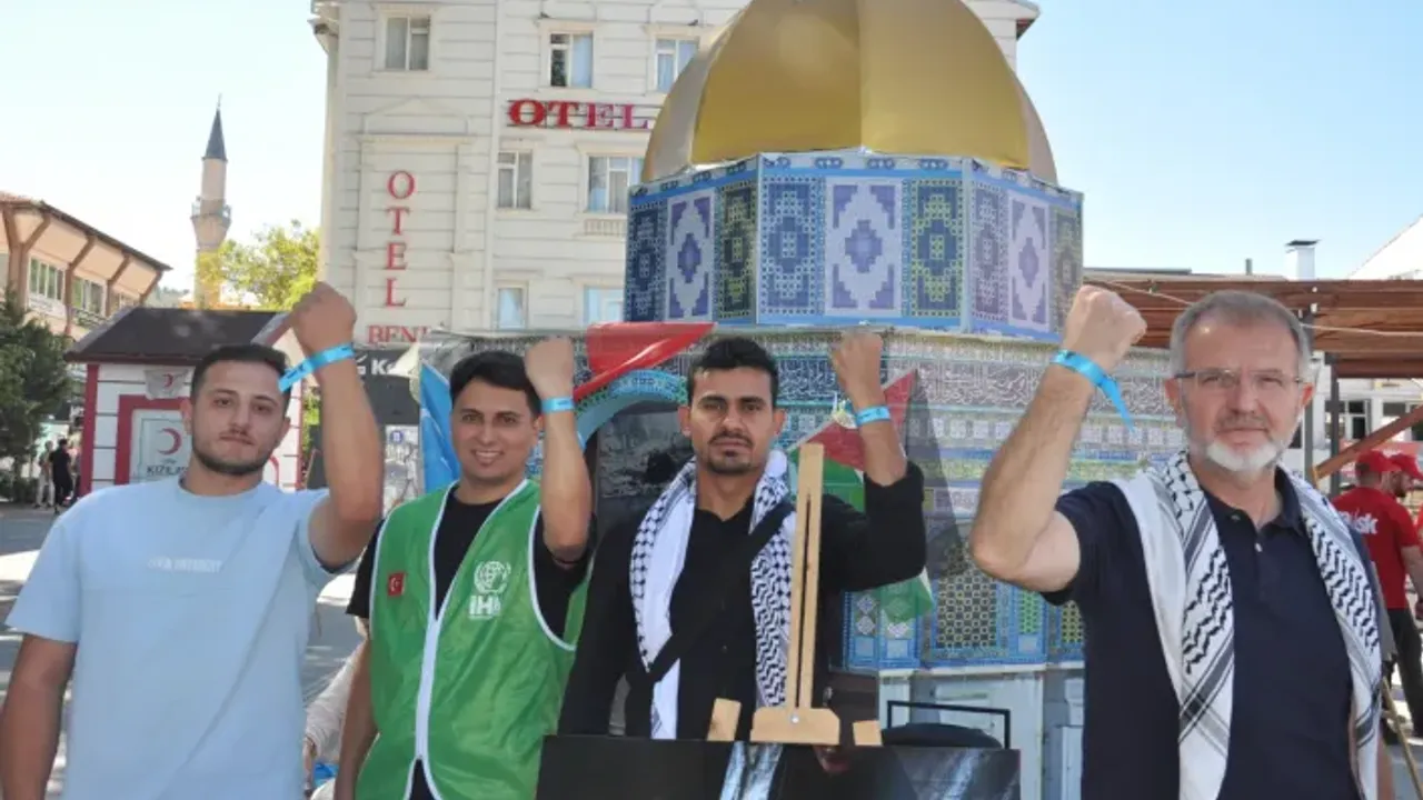 Kütahya'da, İsrail ablukasını kırmak ve insani yardım ulaştırmak hedefiyle Gazze'ye gitmek için yola çıkan Küresel Sumud Filosu'na destek için etkinlik düzenlendi. İHH Kütahya İnsani Yardım Derneği tarafından Zafer Meydanı'nda bulunan Kubbet-üs Sahra maketi önünde düzenlenen etkinlikte vatandaşlara mavi kurdele dağıtıldı.