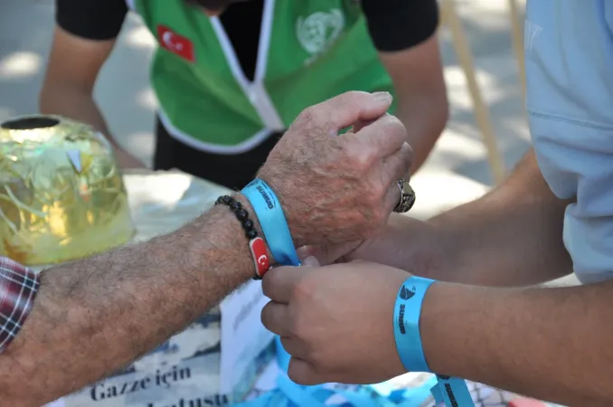 Mavi kurdeleleri bileklerine takan vatandaşlar, Küresel Sumud Filosu'na destek oldu. Derneğin yönetim kurulu üyesi Sebahattin Ceyhun, gazetecilere yaptığı açıklamada, Küresel Sumud Filosu'na yaklaşık 50 ülkeden yüzlerce aktivistin katıldığını hatırlattı. Filoya desteklerini belirtmek için mavi kurdele etkinliğini başlattıklarını dile getiren Ceyhun, şunları kaydetti: "Bu yolculuk 8 ila 10 gün sürecek. İnşallah içimizden geçen, gönlümüzün istediği Gazze’ye ulaşmaları ve yardımları ulaştırıp deniz yolunun açılmasını sağlamaları. Yolları açık olsun, biz bu manada onların yanlarındayız"