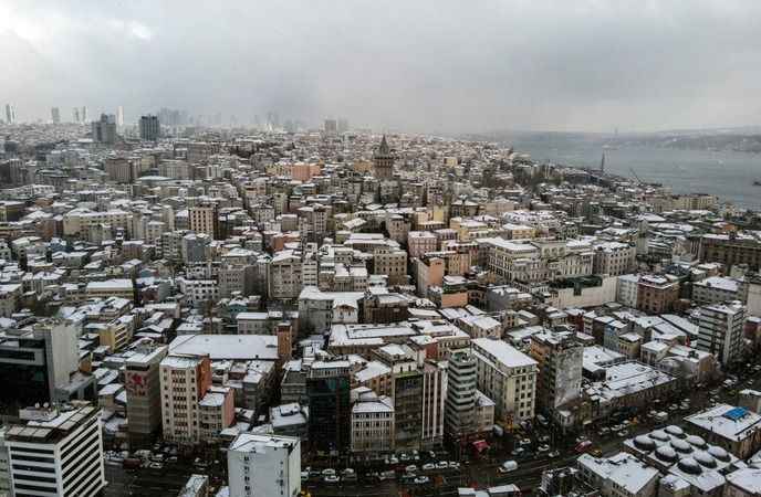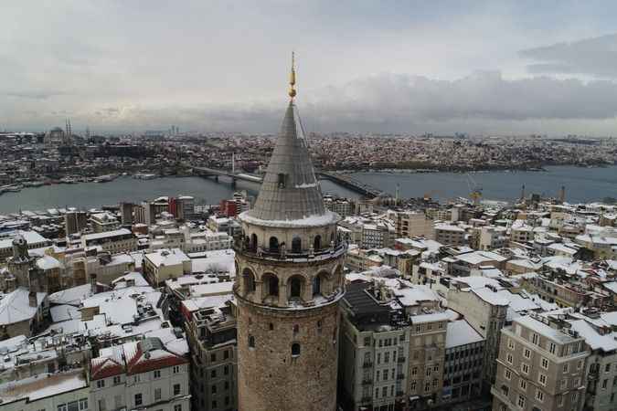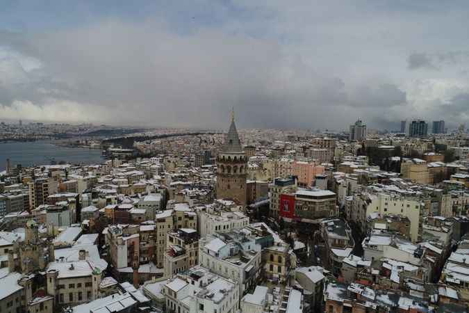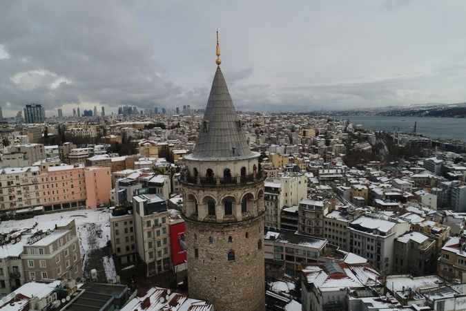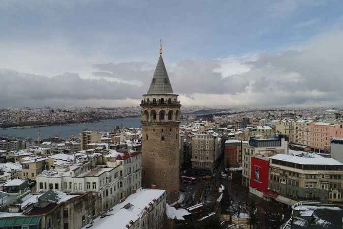Galata Kulesi'nin etrafındaki binalar beyaza bürünürken, ortaya kartpostallık görüntüler çıktı.