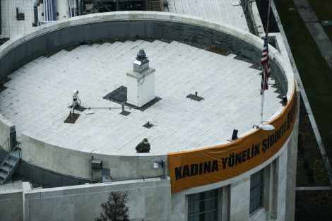 Memur-Sen, Trump'ın kararını ABD'nin Büyükelçiliği önüne çelenk bırakarak protesto etti. Bu sırada Büyükelçilik çatısında silahlı ve tam teçhizatlı bir askeri dikkat çekti.