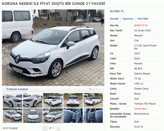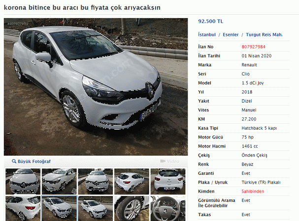 Otomobil piyasası da salgın nedeniyle oldukça etkilenmiş durumda. Aracını satmak isteyen bir araç sahibi korona nedeniyle fiyat düşürdüğünü iddia etmiş