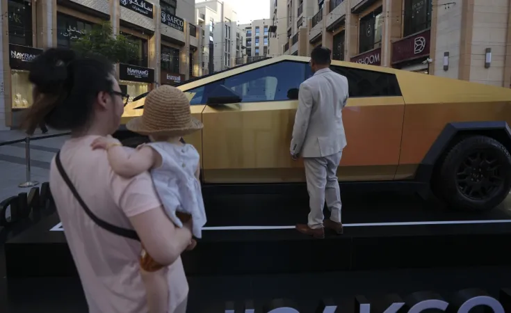Öte yandan çarşının dış tarafında sergilenen ve benzeri olmayan 24 ayar altın kaplama Tesla'nın Cybertruck model arabası da turistlerden büyük ilgi görüyor.