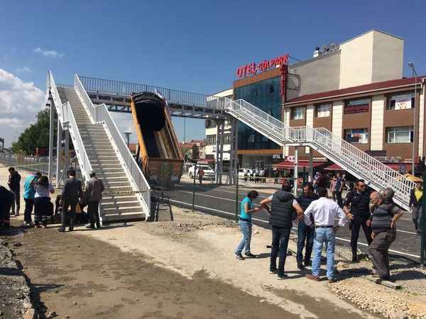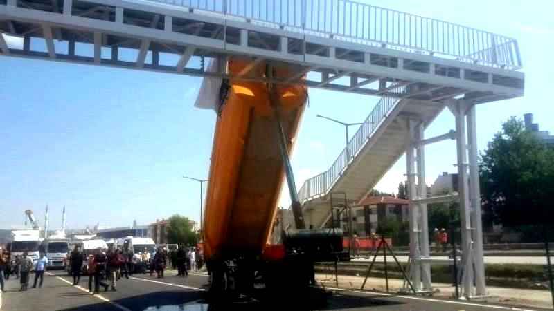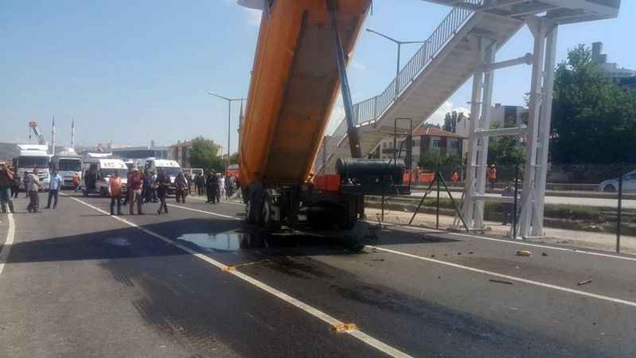 Ankara'nın Gölbaşı ilçesinde hareket halindeki hafriyat kamyonunun açık unutulan damperi üst geçite çarptı. Kazada 11 kişi yaralanırken, kaza anı güvenlik kamerasına yansıdı.