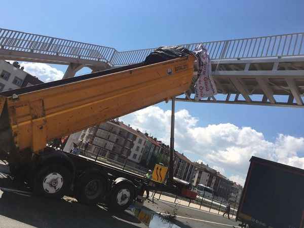 Alınan bilgiye göre, Ankara-Konya Karayolu Gölbaşı şehir merkezinde meydana gelen kazada, Ekrem Keskin idaresindeki 06 DVY 64 plakalı damperi açık unutulan hafriyat kamyonu, üst geçite çarptı.