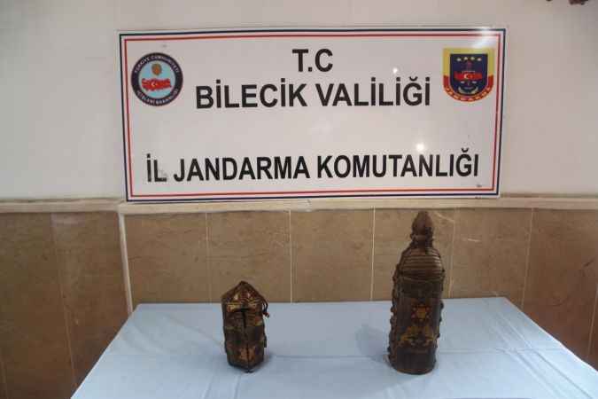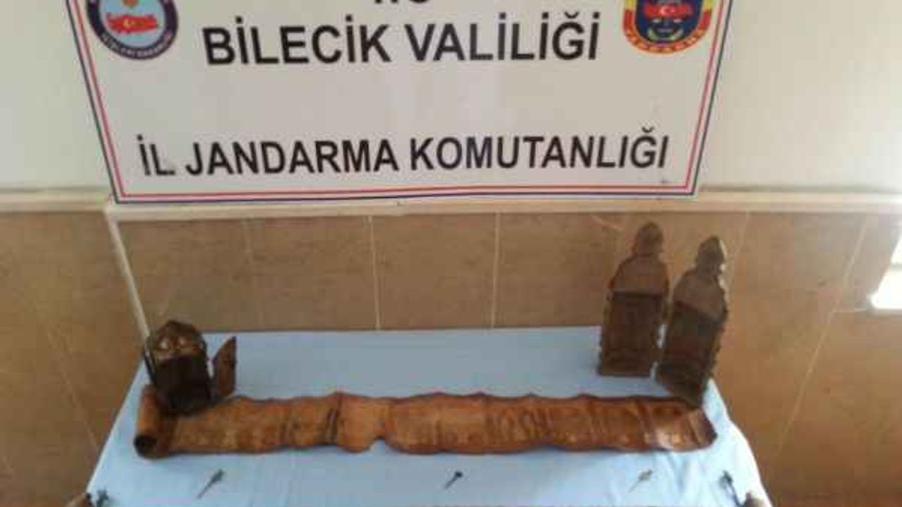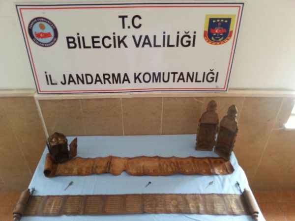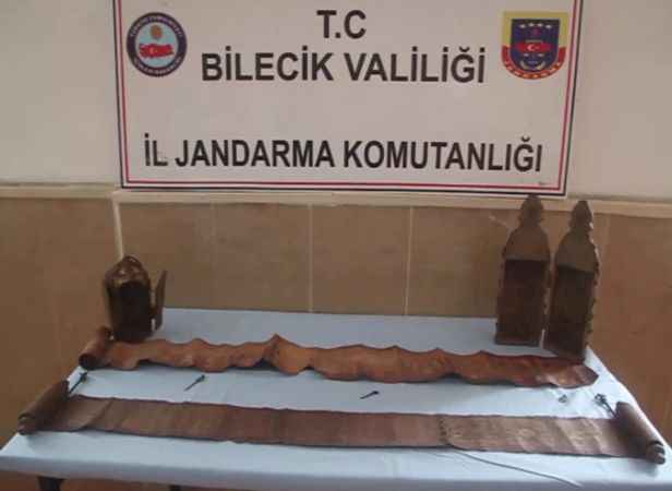 BİLECİK 'te, jandarma ekiplerince düzenlenen operasyonda, otomobilin ses kolonu içinde; ceylan derisi üzerine işlenen, altın varaklı, zümrüt ve yakutlarla süslenen, yaklaşık 8 milyon lira değerinde 2 Tevrat bulundu. Olayla ilgili 5 kişi gözaltına alındı.
