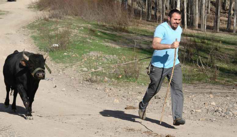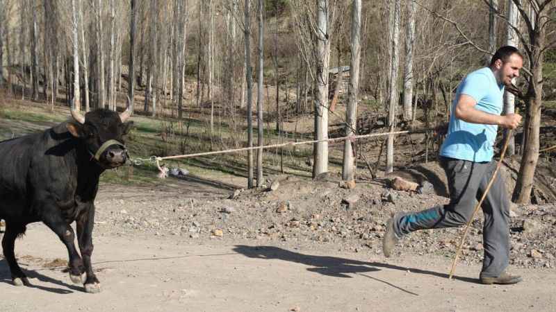 Boğa ile birlikte koşup, tırmanış yapıan Yılmaz, "Boğamın güreşebilmesi için 20 kilo vermesi lazım. Onun için spor yaptırıyoruz" ifadelerini kullandı.
