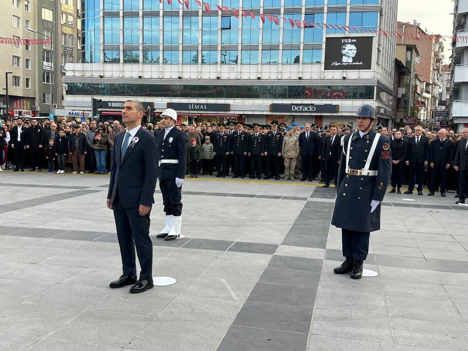 Bayburt'ta Saray Bahçesi'nde düzenlenen törende, Vali Mustafa Eldivan, Atatürk Anıtı'na çelenk sundu.