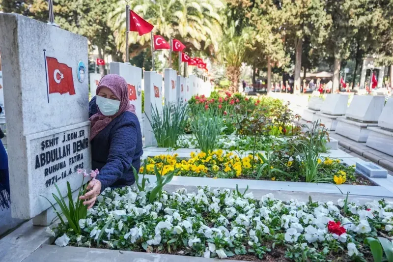 Şehit yakınları ve vatandaşlar şehitlikteki mezarlara çiçek ekti.