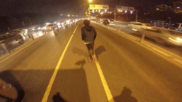 O anları kaydeden çılgın gençlerin seyir halindeyken ayağa kalkmaları yürekleri ağza getirdi. Bir ara aracın üzerinde cep telefonundan oyun bile oynayan gençlerin tehlikeli yolculuğu "bu kadarına da pes" dedirtti. Kendilerini izleyen vatandaşların ve sürücülerin şaşkın bakışları arasında yolculuklarını sürdüren gençler, aracın Zincirlikuyu durağından dönmesi üzerine bindikleri durağa yakın bir yerde indiler. Vatandaşların şaşkın bakışları arasında metrobüsün üstünden durağa atlayan gençler, bu kez de metrobüs yoluna girdi. Yanlarından geçen metrobüslere aldırış etmeden dakikalarca koşan gençler, canlarını hiçe sayıp tehlikeye attı.