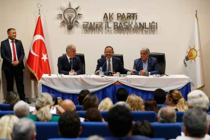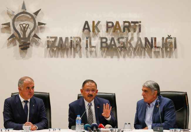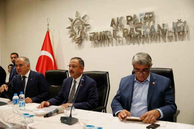 Çevre ve Şehircilik Bakanı Mehmet Özhaseki (ortada), AK Parti İzmir İl Başkanlığı'nı ziyaret etti. 15 Temmuz Şehitleri Konferans salonunda partililerle buluşan Bakan Özhaseki'ye AK Parti İzmir İl Başkanı Bülent Delican (solda) ve AK Parti İzmir Milletvekili Necip Kalkan (sağda) eşlik etti.