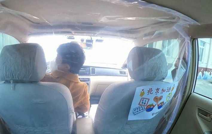Çin'de bir taksici aracının arka koltuğu ile arasını kapatarak virüsten korunmaya çalışıyor.