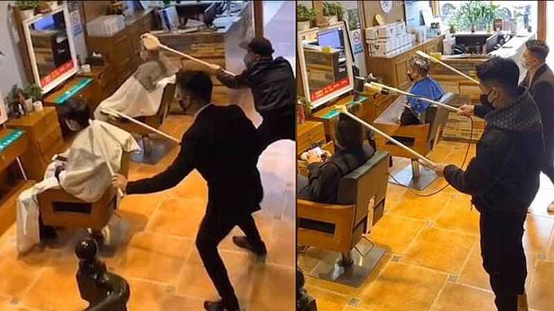 Çin'de berberler Koronavirüs salgınından korunmak için hazırladıkları bir aparat ile müşterilerine çok yaklaşmadan saç kesimi ve benzeri bütün istekleri yerine getirmeye çalışıyor.