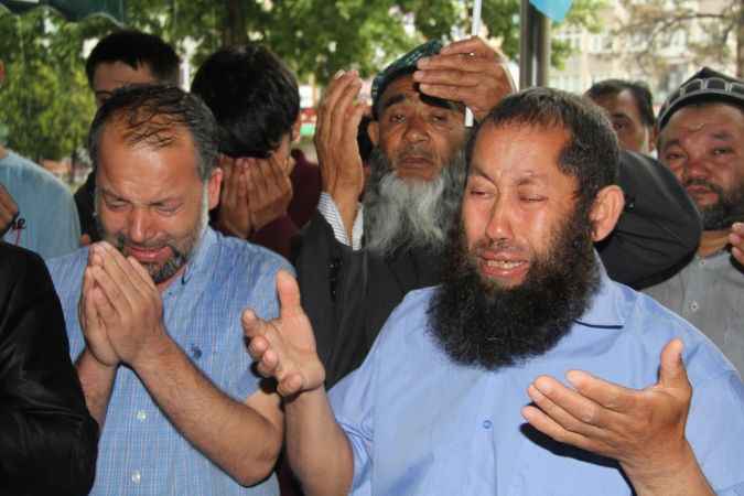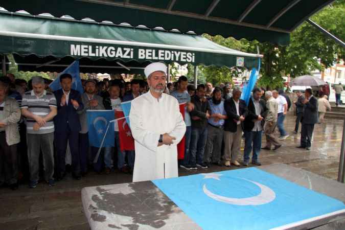 Hunat Camii'nde Cuma namazı çıkışında ellerine aldıkları al ve gök bayrak ile toplanan Uygurlar, 3 gün önce Çin'de hapishanede öldürülen Uygur İslam alimlerinden Abdulehad Barat Mahsum için gıyabi cenaze namazı kıldı.