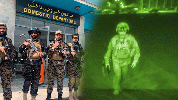ABD Merkez Komutanlığı tarafından paylaşılan gece görüş kamerasıyla çekilen görüntüde ABD Ordusu 82'nci Hava İndirme Tümeni Komutanı Tümgeneral Chris Donahue'ın Kabil'deki Hamid Karzai Uluslararası Havaalanı'ndan ayrılan son C-17 kargo uçağına binerken görüldü.