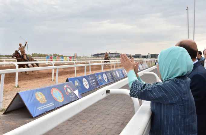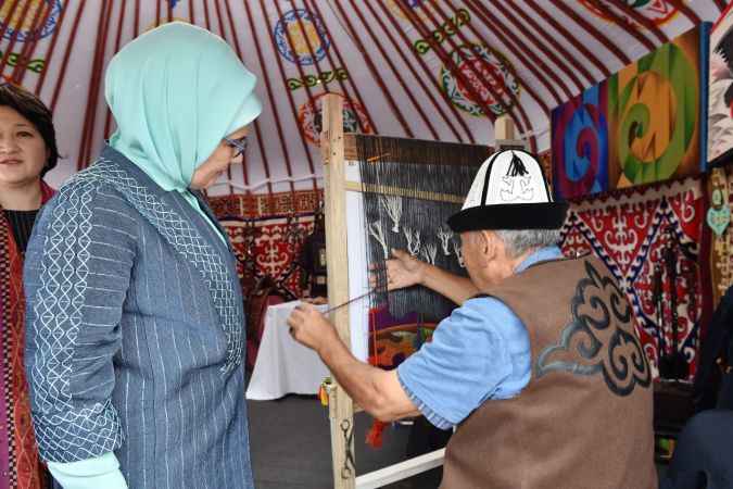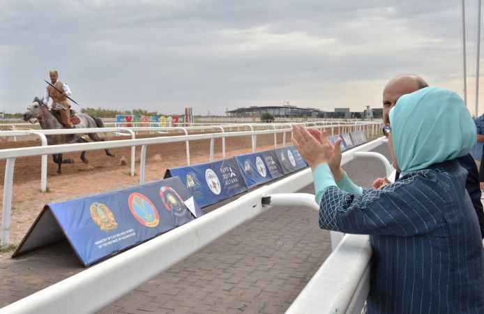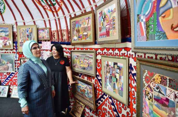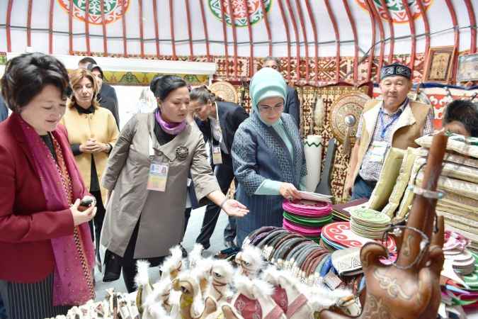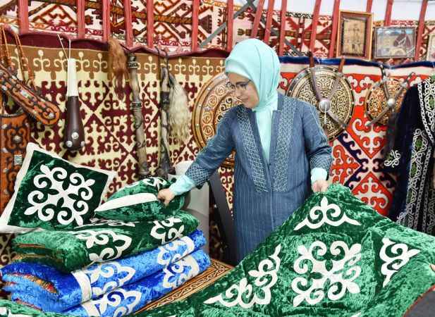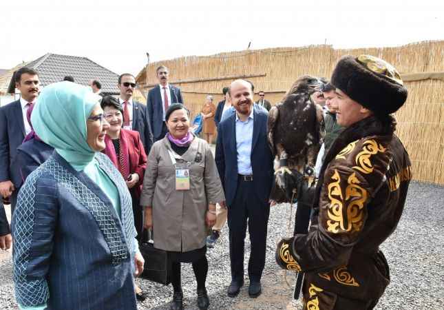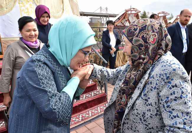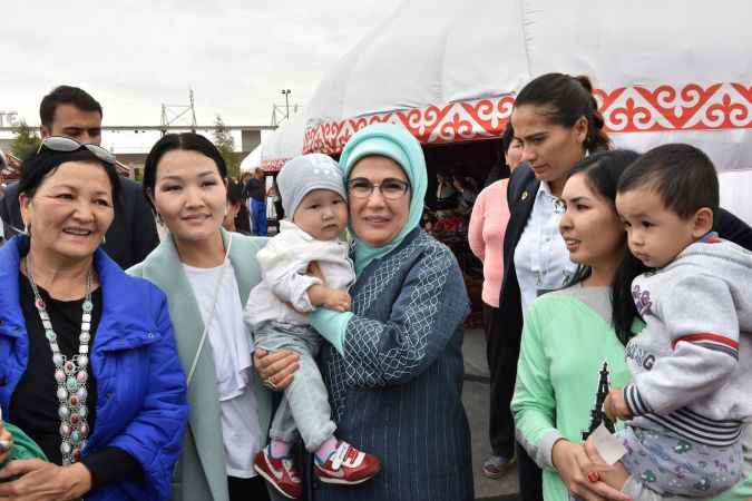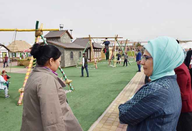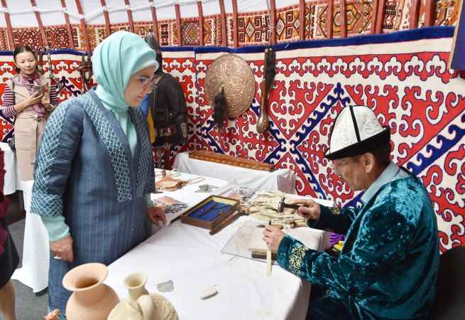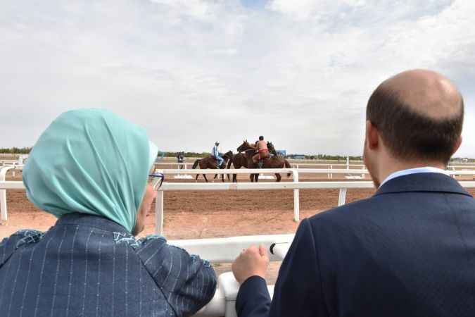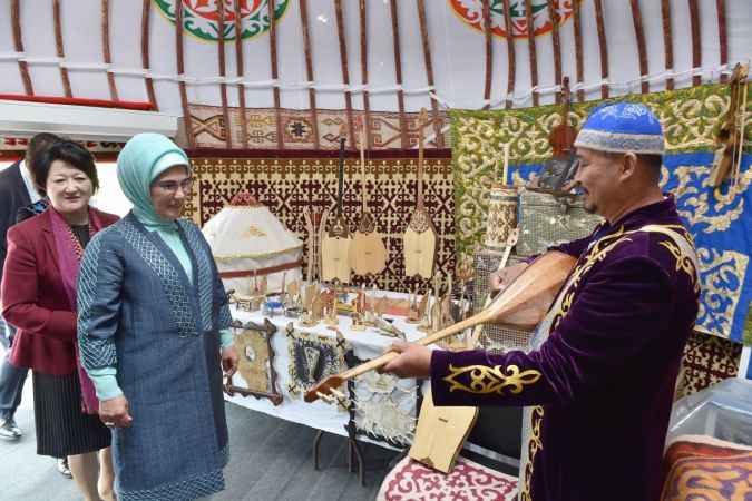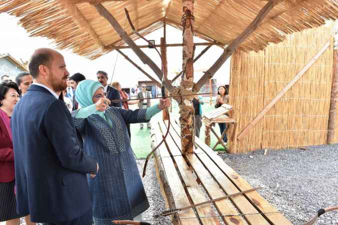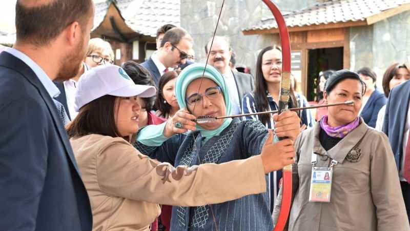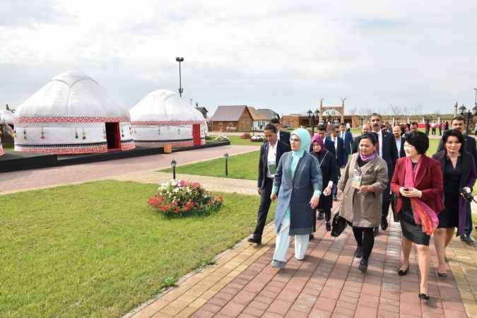 Kazanat Hipodromunda 2 bin 500 metrekare alanda kurulan 30 çadırda Kazak halkının göçebe hayatı, el sanatları ve yemek kültürünün sergilendiği köyde, geleneksel atlı spor gösterilerinin yapıldığı etkinlikte Emine Erdoğan da ok attı.