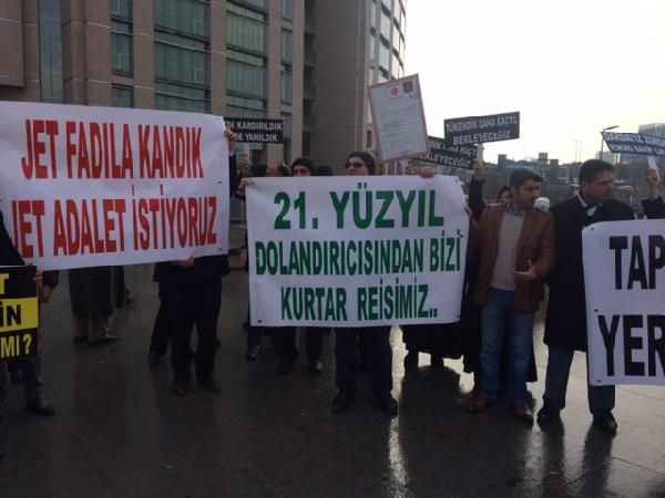 Duruşmanın başlamasından önce, mağdurlarından oluşan bir grup adliye binasının karşısındaki meydanda bir araya geldi. Burada açtıkları pankartlar ve dövizlerle mağduriyetlerine dikkat çeken grup, sloganlar atarak Fadıl Akgündüz'e tepki gösterdi. Kalabalık adına yapılan açıklamada, "Yıllardır bir hukuk mücadelesi veriyoruz. Ve bir türlü bir sonuca ulaşamıyoruz. Çoluk çocuk dışarıda rezil oluyoruz. Yıllardır sürüyor bu. Çekirdek kadar yol alamıyoruz. Devlet büyüklerimize sesleniyoruz. Halen daha devasa reklamlar yayınlıyor. Bizim yatırdığımız paralarla. Para yok deniliyor, para var" denildi.