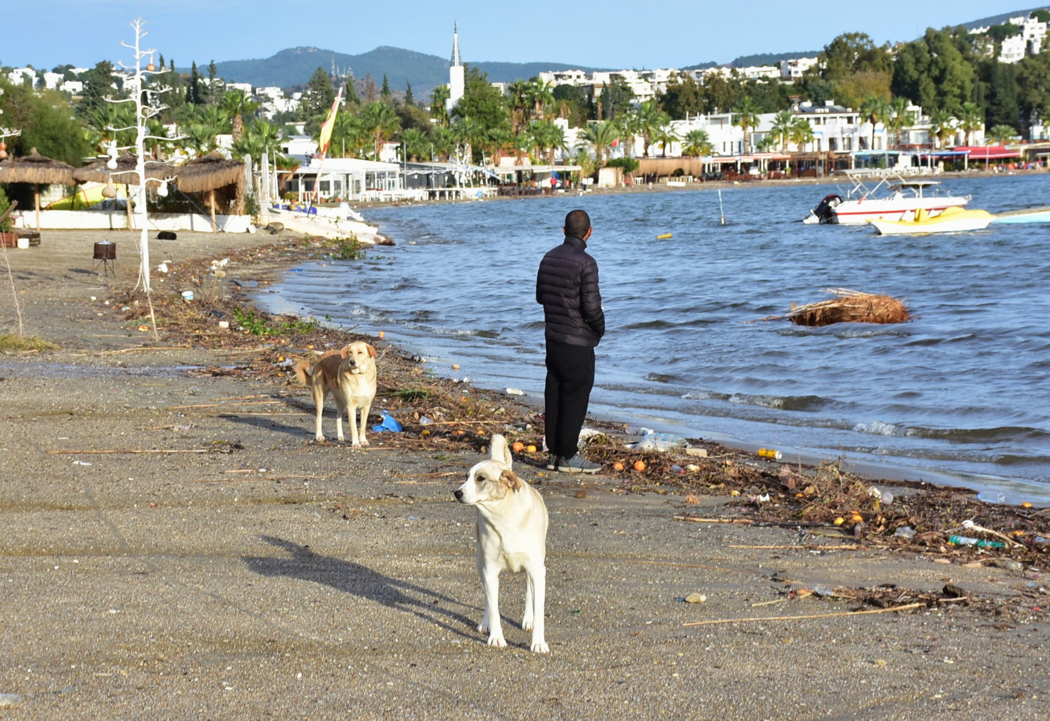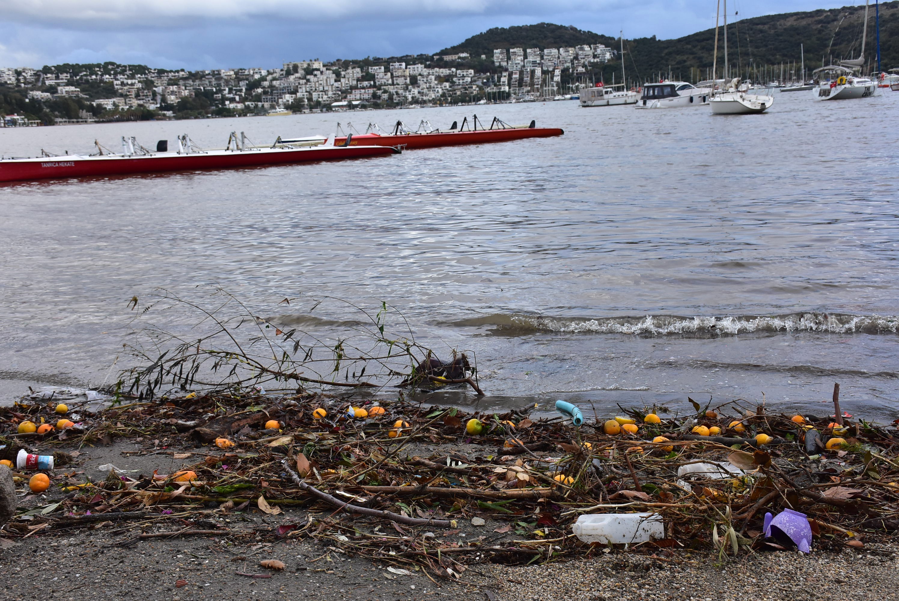 Muğla'nın Bodrum ilçesinde özellikle dün etkili olan sağanağın ardından derelerle denize ulaşan atıklar, kıyıya vurdu.