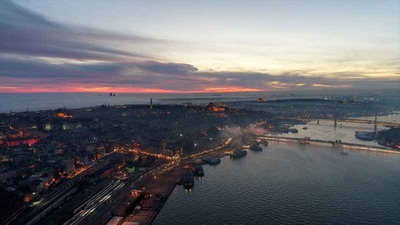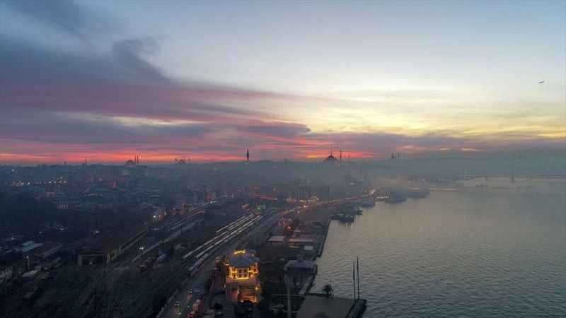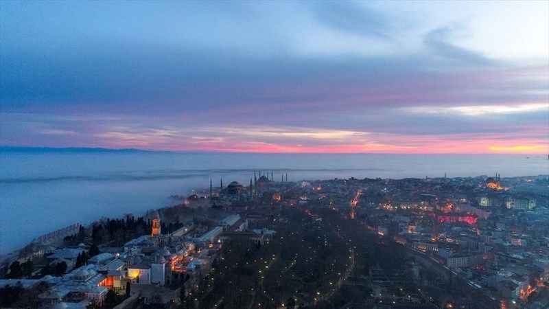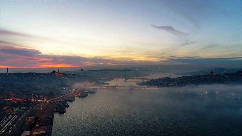 İstanbul'da dün gün boyu etkili olan sis, gün batarkende etkisini sürdürdü. Tarihi yarımada ve Haliç drone ile görüntülendi.