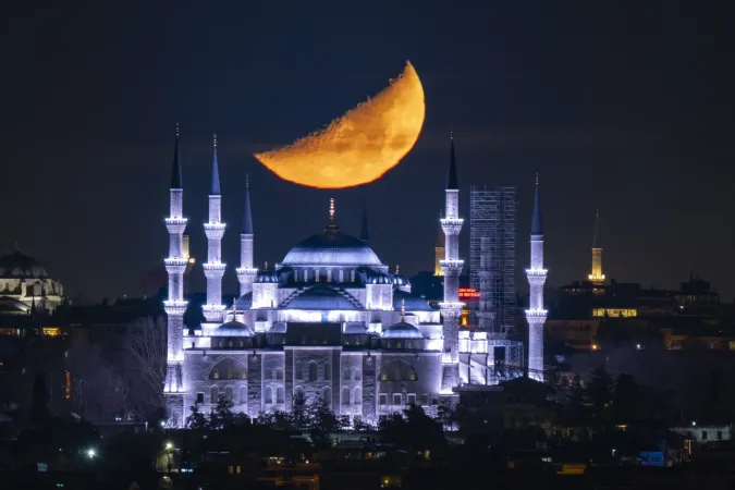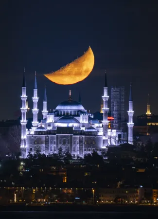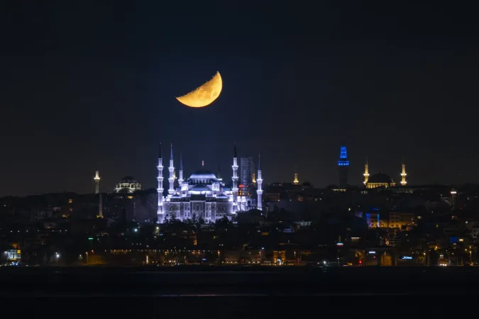 İstanbul'da yarım ay, Sultanahmet Camii (sol 2), Beyazıt Camii (solda), Beyazıt Yangın Kulesi (sağ 2) ve Nuruosmaniye Camii (sağda) ile birlikte görüntülendi.